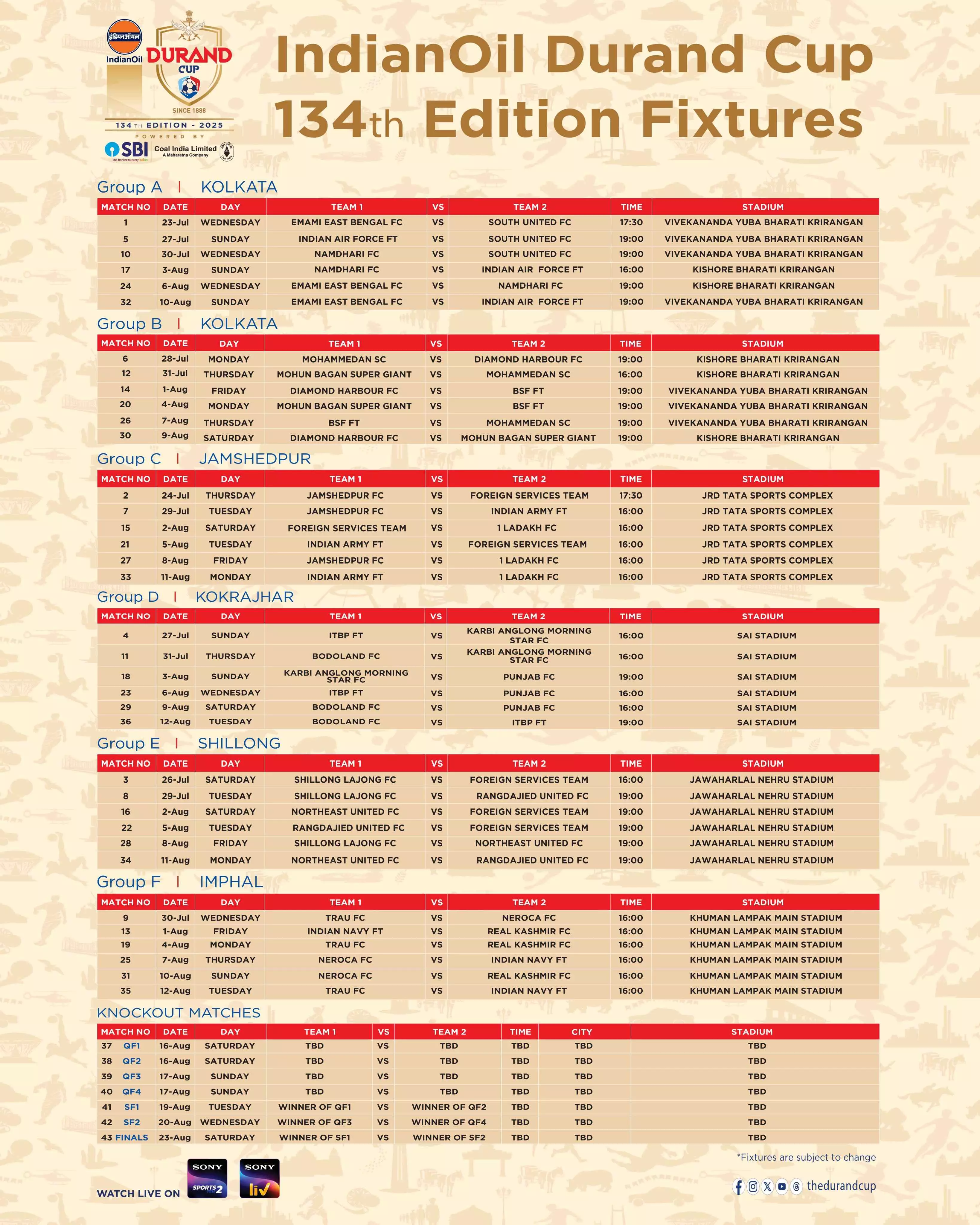 |Fixtures and group For 2025 Durand Cup: डूरंड कप के 134वें सत्र का आगाज 23 जुलाई को कोलकाता के प्रतिष्ठित विवेकानंद युवा भारती क्रीड़ांगन (सॉल्ट लेक स्टेडियम) में होगा। इस रोमांचक टूर्नामेंट का पहला मुकाबला इमामी ईस्ट बंगाल एफसी और बेंगलुरु की साउथ यूनाइटेड एफसी के बीच ग्रुप ए के अंतर्गत खेला जाएगा। एक महीने तक चलने वाले इस टूर्नामेंट में कुल 43 मुकाबले होंगे, जिनका समापन 23 अगस्त को फाइनल मैच के साथ होगा।