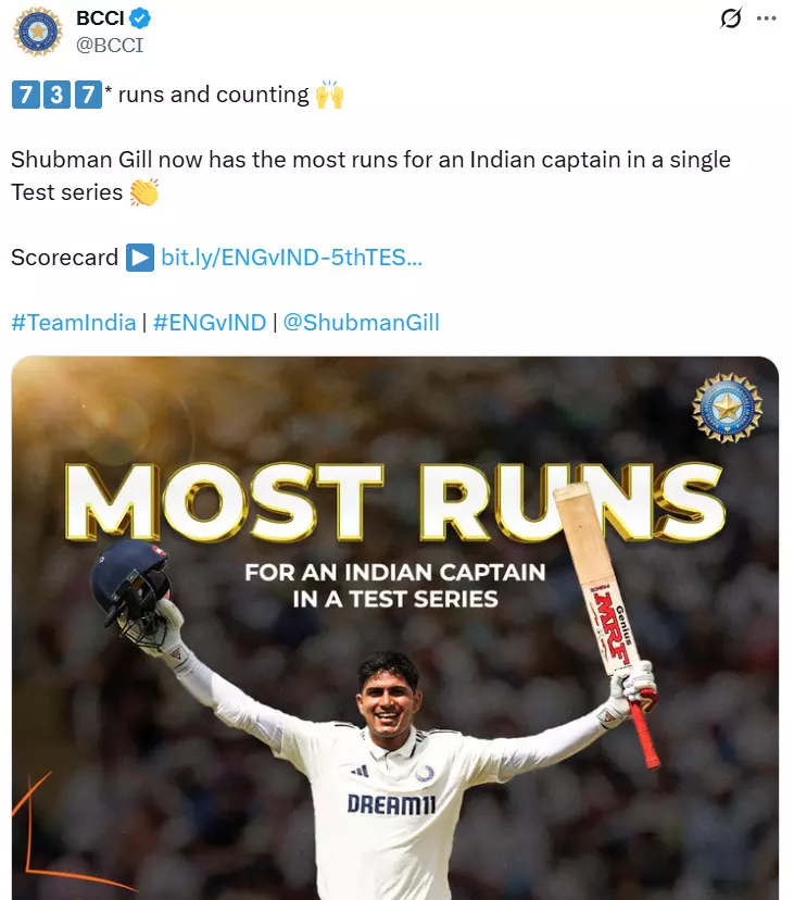केनिंग्टन ओवल टेस्ट में शुभमन गिल ने जैसे ही 11 रन पूरे किए, उन्होंने टेस्ट इतिहास में एक नया रिकॉर्ड अपने नाम कर लिया। इस पारी के साथ ही इंग्लैंड के खिलाफ मौजूदा टेस्ट सीरीज में गिल के कुल रन 733 हो गए हैं। इसके साथ ही वह किसी एक टेस्ट सीरीज में सबसे ज्यादा रन बनाने वाले भारतीय कप्तान बन गए हैं। इस दौरान गिल ने महान बल्लेबाज सुनील गावस्कर का 47 साल पुराना रिकॉर्ड तोड़ा, जिन्होंने 1978-79 में वेस्टइंडीज के खिलाफ सीरीज में 732 रन बनाए थे।