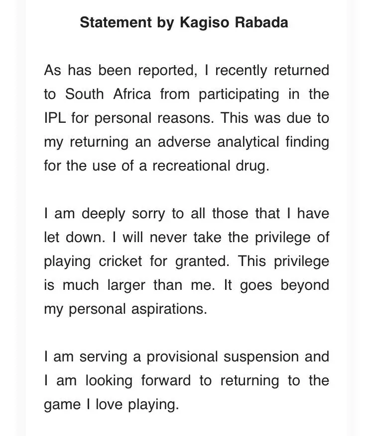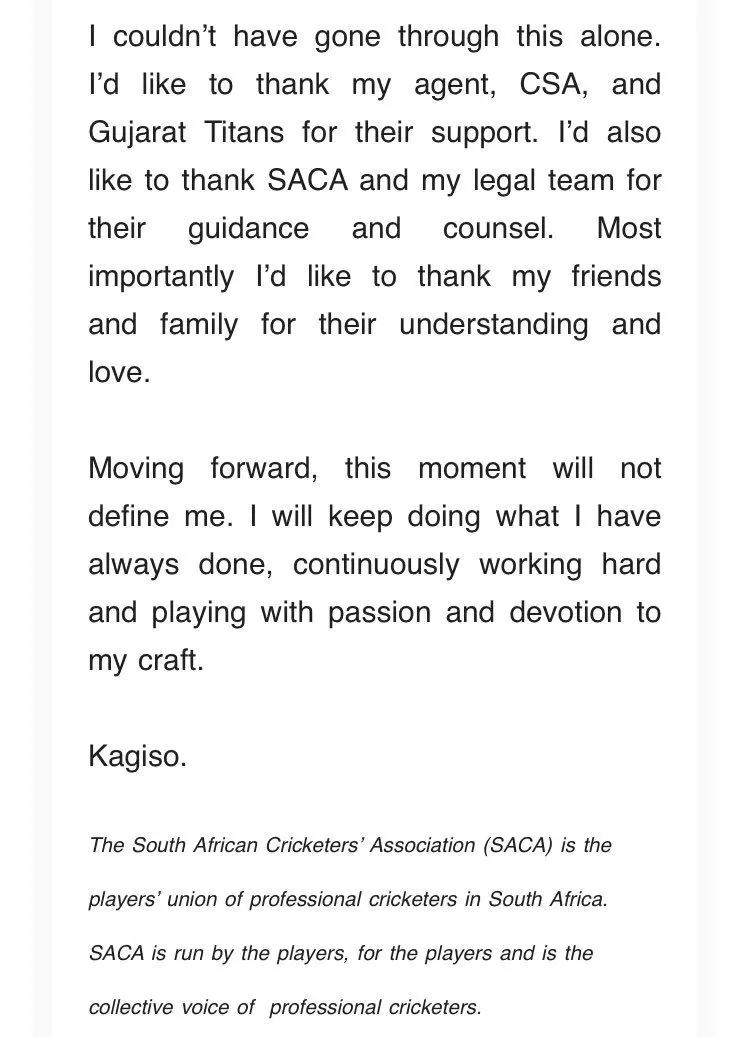 कगिसो रबाडा ने आगे कहा कि वह फिलहाल अस्थायी तौर पर निलंबित हैं, लेकिन वह जल्द ही क्रिकेट मैदान पर वापसी के लिए उत्सुक हैं। उन्होंने इस मुश्किल समय में अपने समर्थन के लिए SACA, गुजरात टाइटंस, अपने एजेंट और कानूनी सलाहकारों का धन्यवाद किया। साथ ही रबाडा ने अपने परिवार और दोस्तों का आभार जताया, जिनकी मदद के बिना वह इस स्थिति से नहीं उबर पाते। उन्होंने यह भी कहा कि इस गलती से उनका करियर तय नहीं होगा और वह पहले से अधिक मेहनत करेंगे।