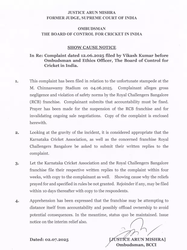|RCB Celebration Stampede: BCCI के लोकपाल जस्टिस अरुण मिश्रा (रिटायर्ड) ने रॉयल चैलेंजर्स बेंगलुरु (RCB) और कर्नाटक राज्य क्रिकेट संघ (KSCA) से जवाब मांगा है। यह कार्रवाई उस शिकायत के बाद की गई है जिसमें दोनों पर लापरवाही और सुरक्षा नियम तोड़ने का आरोप लगा है। बता दें कि 4 जून को RCB की जीत का जश्न मनाने के दौरान भगदड़ मच गई थी। इस हादसे में 11 लोगों की मौत हो गई थी और 50 से ज्यादा लोग घायल हुए थे।