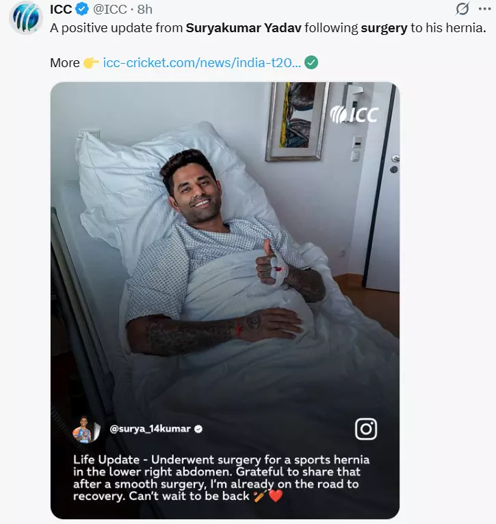 भारतीय टी20 टीम के कप्तान सूर्यकुमार यादव ने अपनी हेल्थ को लेकर सोशल मीडिया पर अपडेट साझा किया है। उन्होंने इंस्टाग्राम पर पोस्ट करते हुए बताया कि उनके पेट के निचले दाहिने हिस्से में स्पोर्ट्स हर्निया की सर्जरी हुई है। सूर्यकुमार ने लिखा, "मुझे यह बताते हुए अच्छा लग रहा है कि सर्जरी सफल रही और अब मैं रिकवरी कर रहा हूं।" उन्होंने आगे कहा कि वह अब दोबारा क्रिकेट मैदान पर लौटने के लिए बेहद उत्साहित हैं।