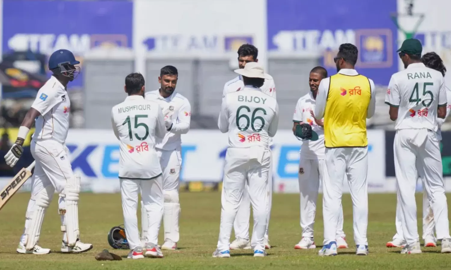 अपने विदाई टेस्ट में एंजेलो मैथ्यूज ने पहली पारी में 39 रनों की उपयोगी पारी खेली। वह चौथे नंबर पर बल्लेबाजी के लिए आए और 69 गेंदों में 3 चौके और 1 छक्के की मदद से यह स्कोर बनाया। उनका विकेट पार्ट टाइम गेंदबाज मोमिनुल हक ने लिया। 38 वर्षीय मैथ्यूज ने 2009 में पाकिस्तान के खिलाफ टेस्ट डेब्यू किया था। यह उनका 119वां टेस्ट मैच है। अब तक 211 पारियों में वे 8206 रन बना चुके हैं। श्रीलंका के लिए टेस्ट क्रिकेट में कुमार संगकारा और महेला जयवर्धने के बाद तीसरे सबसे बड़े रन स्कोरर बन गए हैं।