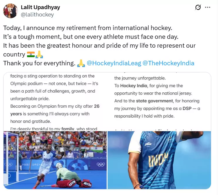 |Lalit Upadhyay Retirement : भारतीय हॉकी टीम के अनुभवी फारवर्ड ललित उपाध्याय ने दो दशकों से अधिक लंबे शानदार करियर के बाद अंतरराष्ट्रीय हॉकी से संन्यास की घोषणा कर दी है। वाराणसी के इस होनहार खिलाड़ी ने पेरिस ओलंपिक 2024 और टोक्यो ओलंपिक 2020 में ब्रॉन्ज मेडल जीतने वाली भारतीय टीम में अहम भूमिका निभाई थी। 2014 वर्ल्ड कप से अंतरराष्ट्रीय करियर की शुरुआत करने वाले ललित के लिए ओलंपिक पदक जीतना उनके करियर की सबसे बड़ी उपलब्धियों में शामिल रहा।