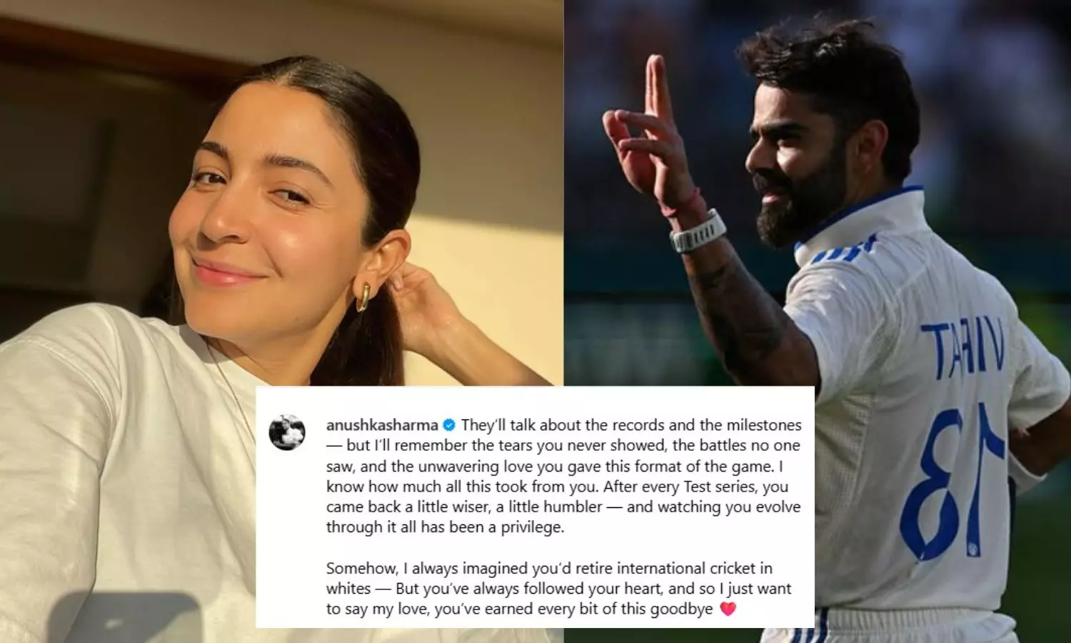 विराट के रिटायर्मेंट पर अनुष्का शर्मा ने भावुक पोस्ट साझा कर लिखा, ‘लोग तुम्हारे रिकॉर्ड्स और माइलस्टोन्स की बात करेंगे लेकिन मुझे वो आँसू याद रहेंगे जो तुमने कभी नहीं दिखाए, वो जंगें जो किसी ने नहीं देखीं, और वो प्यार जो तुमने इस फॉर्मेट को दिया। मुझे पता है कि ये सब करने में तुमने खुद को कितना झोंक दिया’