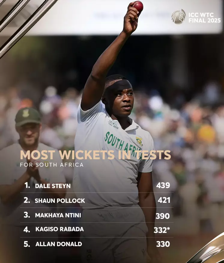 लॉर्ड्स के ऐतिहासिक मैदान पर कागिसो रबाडा की घातक गेंदबाज़ी ने ऑस्ट्रेलिया की बल्लेबाज़ी की रीढ़ तोड़ दी। टॉस जीतकर पहले गेंदबाज़ी करने उतरी साउथ अफ्रीका को रबाडा ने शानदार शुरुआत दिलाई। उन्होंने 15.4 ओवर में केवल 51 रन खर्च करते हुए 5 विकेट झटके। रबाडा ने पहले ओवर में ही उस्मान ख्वाजा को शून्य पर पवेलियन भेजा। इसके बाद उन्होंने कैमरून ग्रीन (4), ब्यू वेबस्टर (72), पैट कमिंस (1) और मिचेल स्टार्क (1) को भी अपना शिकार बनाया। उनके इस पांच विकेट हॉल की बदौलत ऑस्ट्रेलिया की पूरी टीम पहली पारी में 212 रन पर सिमट गई।