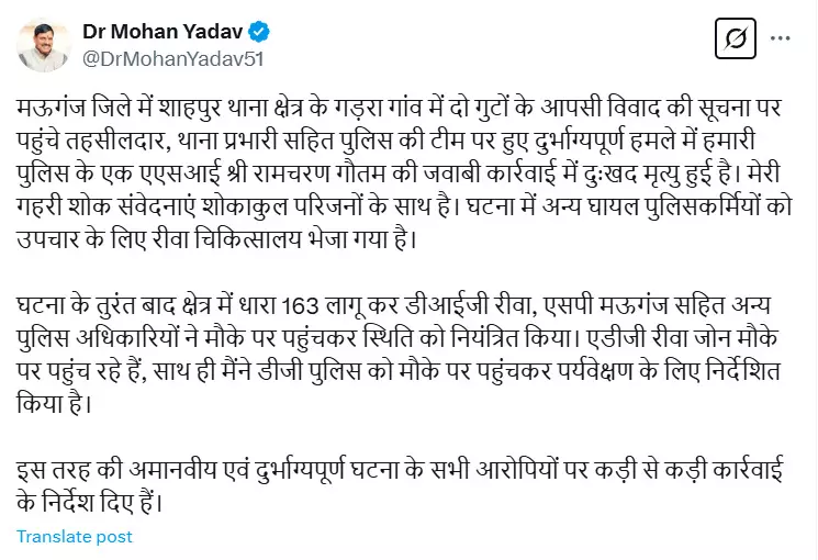 सीएम डॉ. मोहन यादव ने कहा - "मऊगंज जिले में शाहपुर थाना क्षेत्र के गड़रा गांव में दो गुटों के आपसी विवाद की सूचना पर पहुंचे तहसीलदार, थाना प्रभारी सहित पुलिस की टीम पर हुए दुर्भाग्यपूर्ण हमले में हमारी पुलिस के एक एएसआई रामचरण गौतम की जवाबी कार्रवाई में दुःखद मृत्यु हुई है। मेरी गहरी शोक संवेदनाएं शोकाकुल परिजनों के साथ है। घटना में अन्य घायल पुलिसकर्मियों को उपचार के लिए रीवा चिकित्सालय भेजा गया है।"
