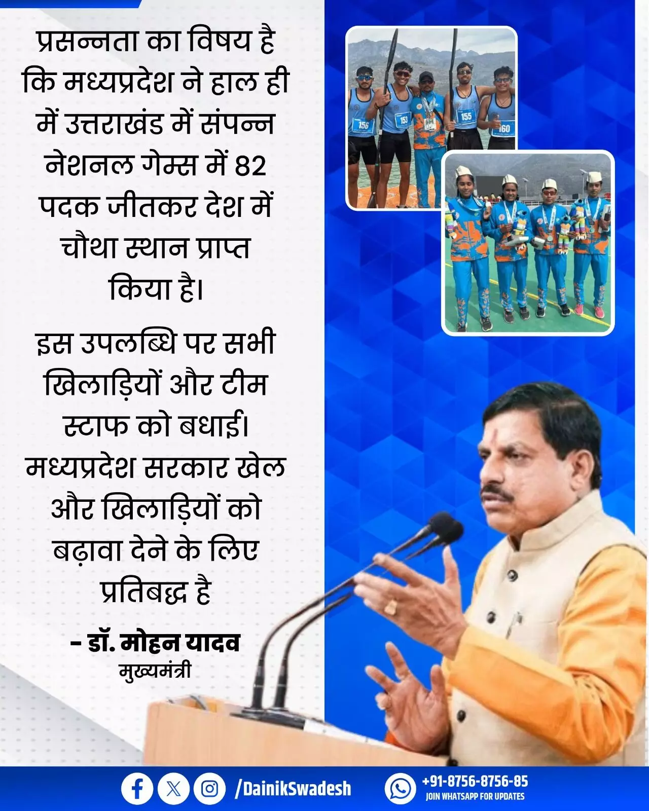 |MP Athletes Shine at National Games: मध्यप्रदेश के लिए गर्व का क्षण तब हुआ जब राज्य के खिलाड़ियों ने हाल ही में उत्तराखंड में आयोजित नेशनल गेम्स में शानदार प्रदर्शन किया । वहीं कुल 82 पदक जीतकर देशभर में चौथा स्थान हासिल किया। मुख्यमंत्री डॉ. मोहन यादव ने इस उपलब्धि पर राज्य के सभी खिलाड़ियों और टीम स्टाफ को बधाई दी है।