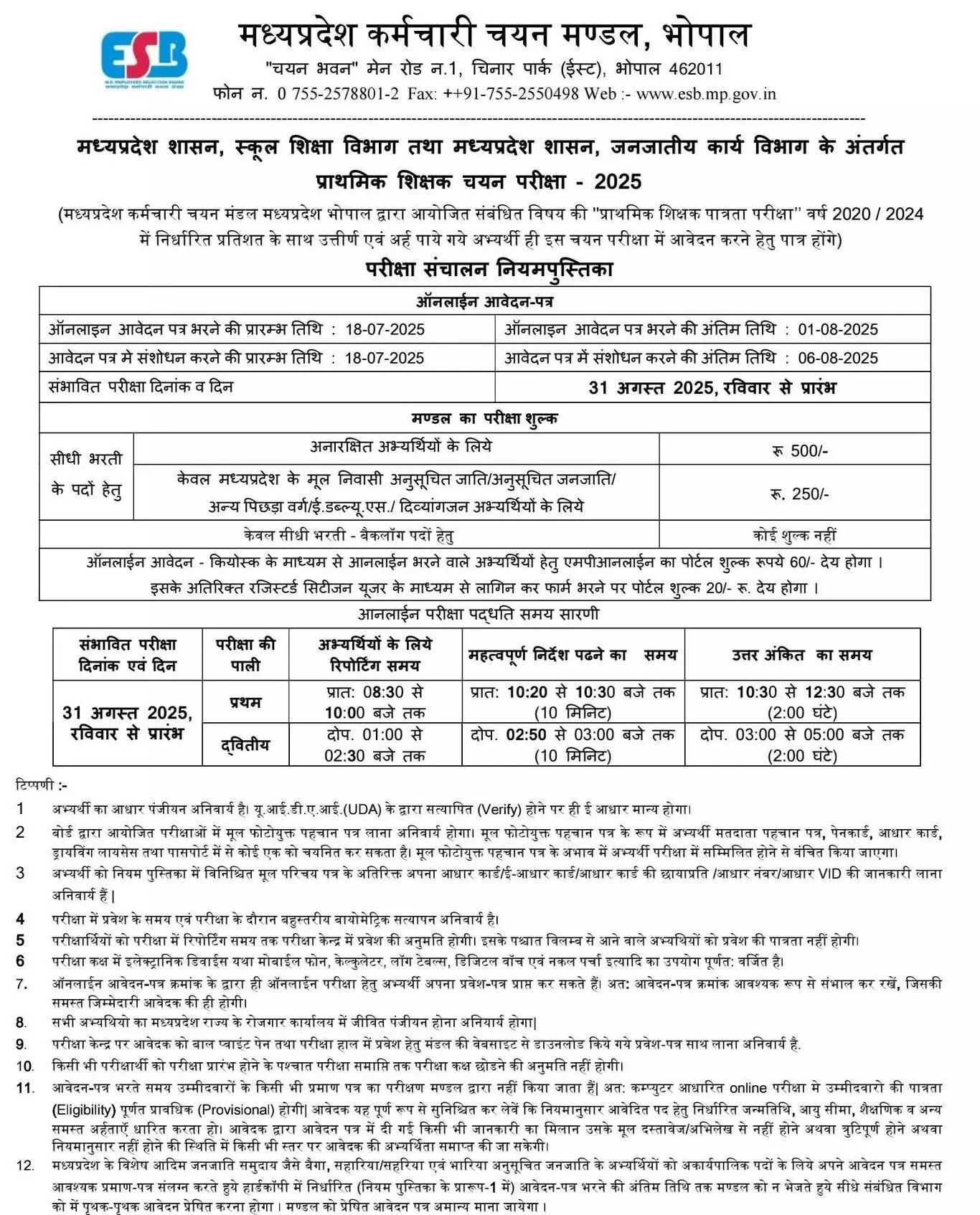 MP NEWS : मध्यप्रदेश के बेरोजगार युवाओं के लिए एक बड़ी खुशखबरी सामने आई है। मध्यप्रदेश कर्मचारी चयन मंडल, भोपाल ने स्कूल शिक्षा विभाग एवं जनजातीय कार्य विभाग के अंतर्गत प्राथमिक शिक्षक चयन परीक्षा 2025 के लिए भर्ती प्रक्रिया शुरू कर दी है। इस भर्ती के तहत लगभग 13,000 पदों के लिए विज्ञापन आज आधिकारिक रूप से जारी किया गया है।