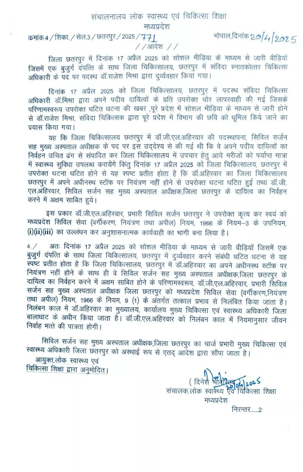 छतरपुर मामले पर एक्शन: सिविल सर्जन डॉ. जीएल अहिरवार निलंबित, बुजुर्ग के साथ मारपीट का मामला
