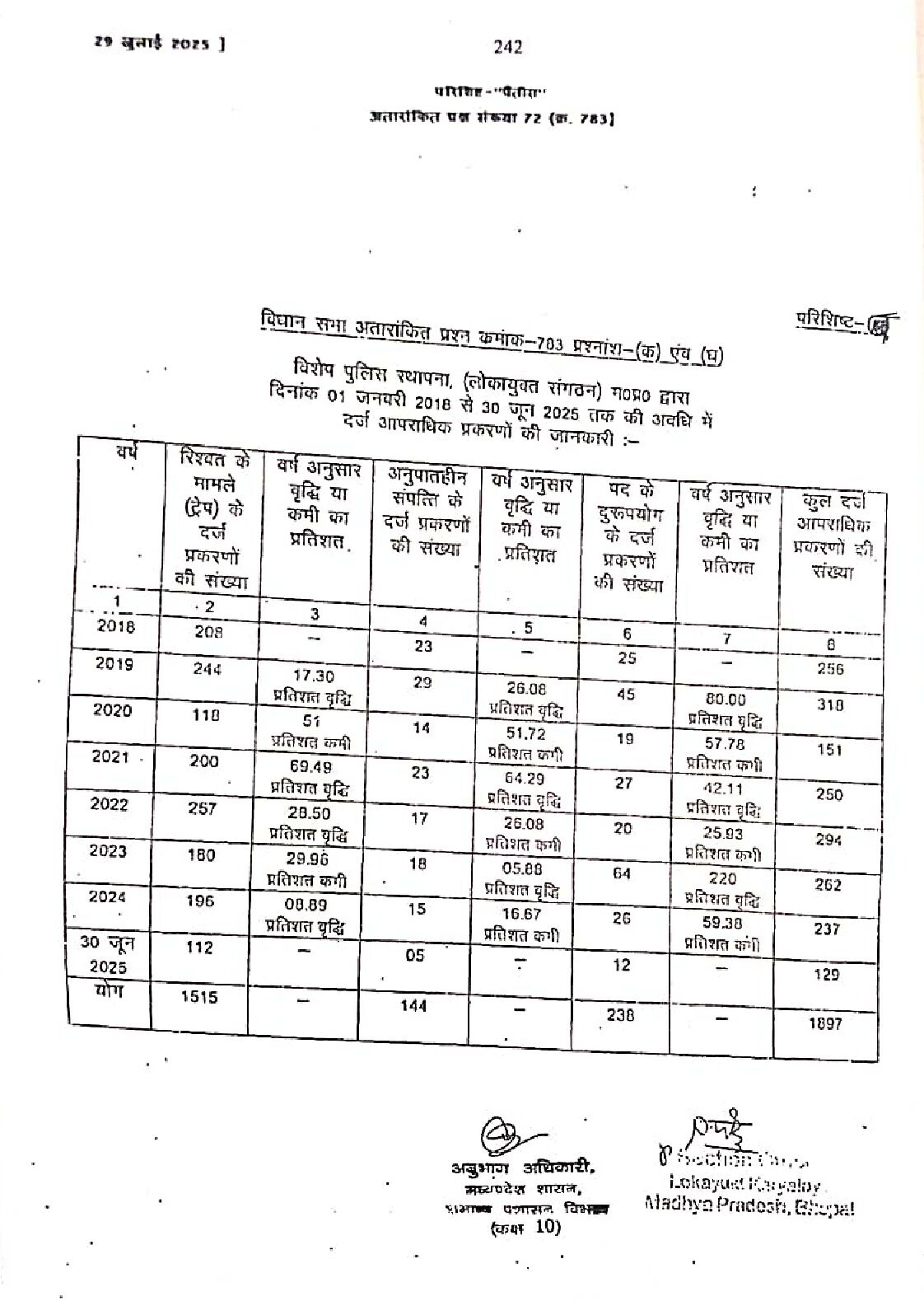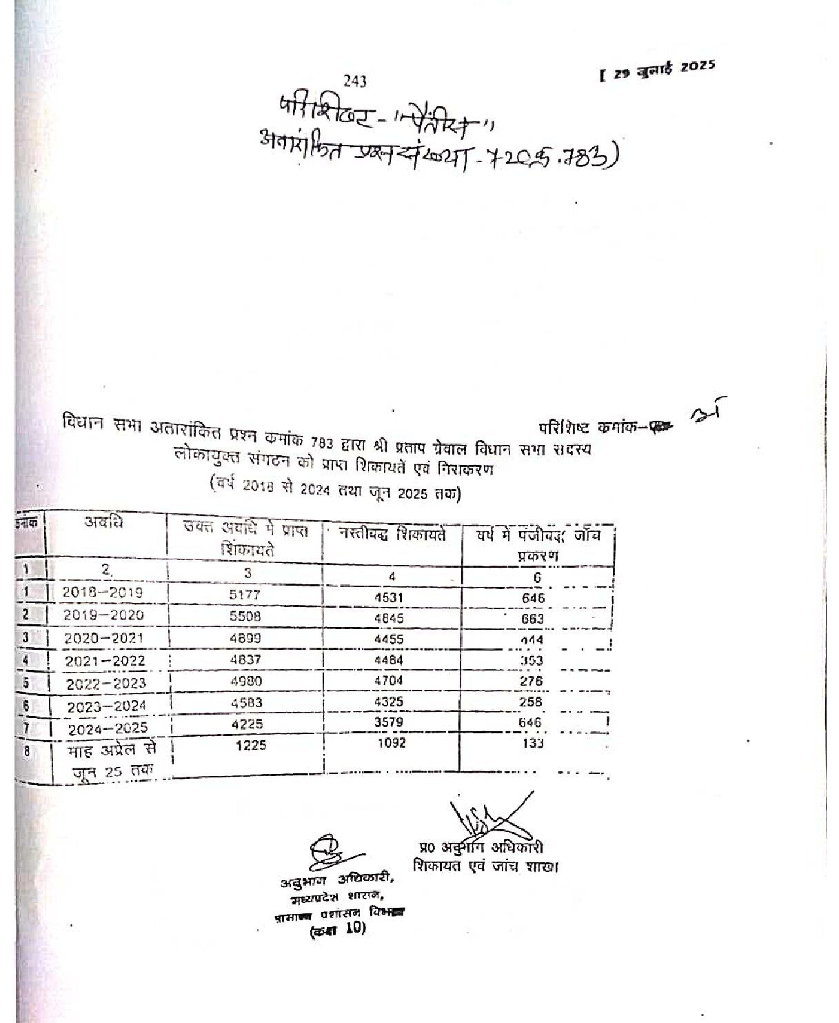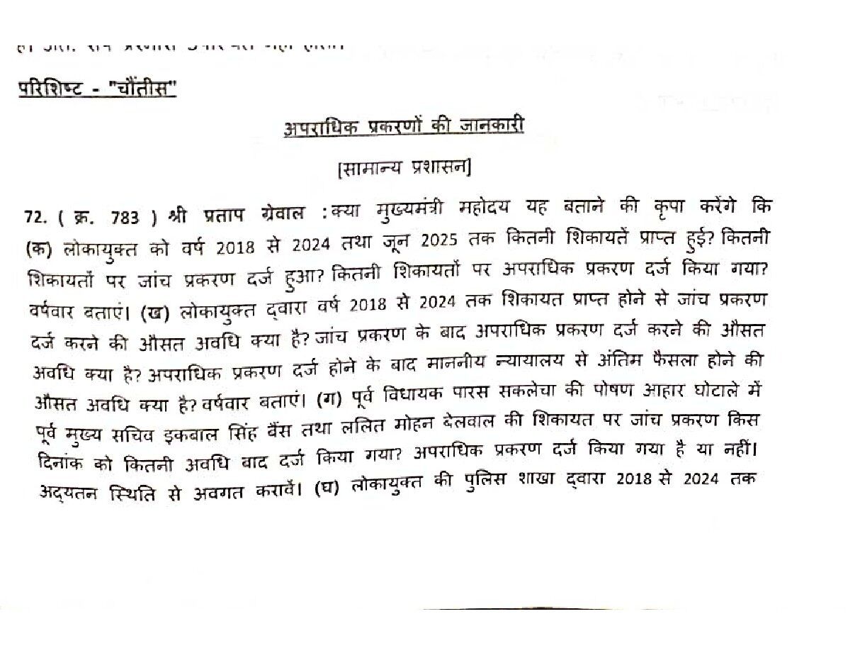 कांग्रेस विधायक प्रताप ग्रेवाल के सवाल पर मुख्यमंत्री डॉ. मोहन यादव ने बताया कि, 2018-2019 से जून 2025 तक लोकायुक्त की 35, 434 शिकायतें मिली तथा इस अवधि में 3419 जांच प्रकरण दर्ज किए गए तथा 1515 रिश्वत 144 अनुपात हीन संपत्ति तथा 236 पद के दुरुपयोग के अपराधिक प्रकरण दर्ज किए गए। विधायक प्रताप ग्रेवाल ने कहा कि, निराकरण में हो रहे विलंब के कारण लोकायुक्त में शिकायतो में निरंतर कमी हो रही हैl