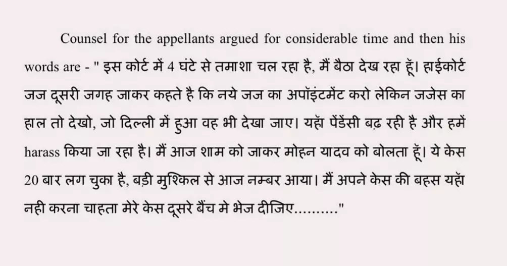 आदेश के अनुसार उन्होंने कहा था कि, "यह नाटक इस न्यायालय में पिछले 4 घंटों से चल रहा है, मैं बैठकर देख रहा हूं। उच्च न्यायालय के न्यायाधीश अन्य स्थानों पर जाते हैं और नए न्यायाधीशों की नियुक्ति करने के लिए कहते हैं लेकिन न्यायाधीशों की स्थिति देखें, दिल्ली में जो हुआ वह भी देखा जाना चाहिए। यह दबाव बढ़ रहा है, और हमें परेशान किया जा रहा है। मैं आज शाम को जाकर मोहन यादव से बात करूंगा। यह मामला 20 बार आ चुका है, और बड़ी मुश्किल से आज इसे सूचीबद्ध किया गया है। मैं इस अराजकता में अपना मामला बहस नहीं करना चाहता, इसे किसी अन्य पीठ को भेजा जाना चाहिए।"