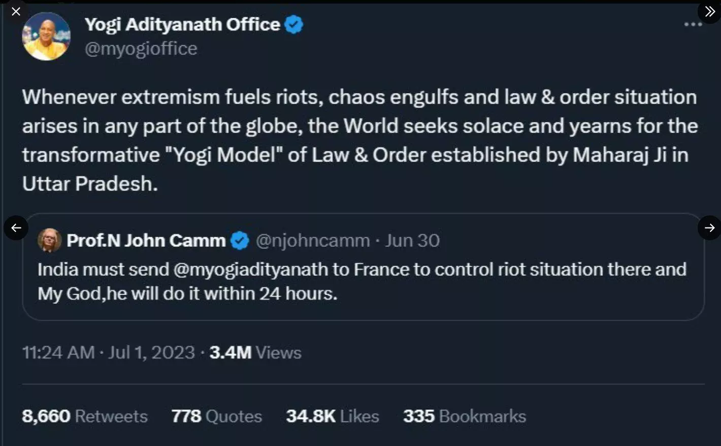 नरेंद्र विक्रमादित्य यादव जो खुद को एन कैम जॉन बताता था, ने साल 2023 में फ्रांस में हुए दंगों के बाद सीएम योगी आदित्यनाथ को वहां भेजने के लिए भी कहा था। योगी आदित्यनाथ कार्यालय के एक्स अकाउंट से उसे जवाब भी दिया गया था। इसके अलावा यह फर्जी डॉक्टर कांग्रेस की आलोचना करना और विवादित टिप्पणी करने का काम भी किया करता था।
