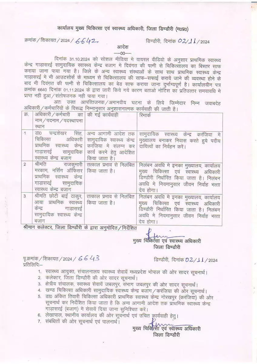 जानकारी के अनुसार मुख्य चिकित्सा एवं स्वास्थ्य अधिकारी डिंडोरी ने जिले में घटित आपत्तिजनक एवं अमानवीय घटना के लिए जिम्मेदार अधिकारियों एवं कर्मचारियों के विरुद्ध अनुशासनात्मक कार्रवाई की है। इस संबंध में जारी आदेश के अनुसार प्राथमिक स्वास्थ्य केंद्र गरदासरी में पदस्थ चिकित्सा अधिकारी डॉ. चंद्रशेखर सिंह को आगामी आदेश तक सामुदायिक स्वास्थ्य केंद्र करंजिया में अटैच किया गया है। साथ ही प्राथमिक स्वास्थ्य केंद्र गरदासरी में पदस्थ नर्सिंग अधिकारी राजकुमारी एवं आया छोटी बाई ठाकुर को तत्काल प्रभाव से निलंबित कर दिया गया है।