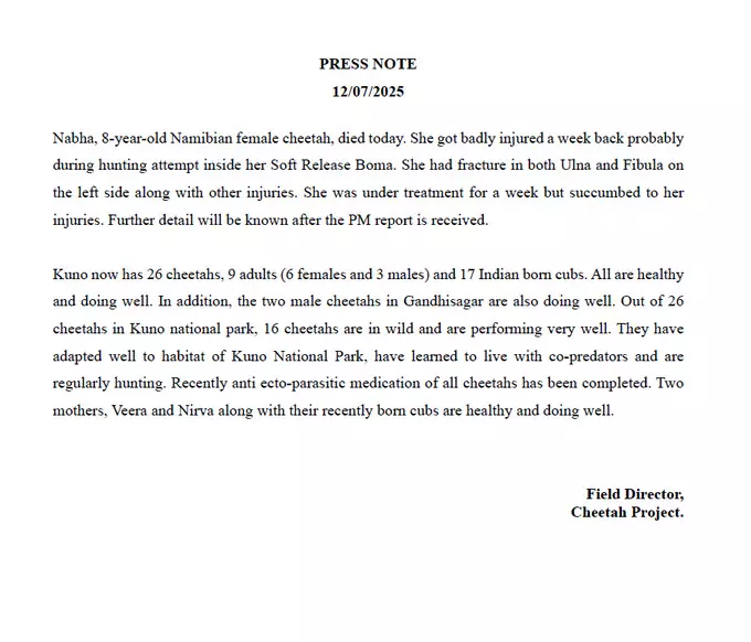 जानकारी के मुताबिक, 8 वर्षीय नामीबियाई मादा चीता नाभा के बाईं ओर अल्ना और फिबुला दोनों में फ्रैक्चर के साथ-साथ अन्य चोटें भी थीं। उसका एक सप्ताह तक इलाज चला, लेकिन उसकी चोटों के कारण उसकी मृत्यु हो गई। आगे की जानकारी पोस्टमार्टम रिपोर्ट आने के बाद ही पता चलेगी।