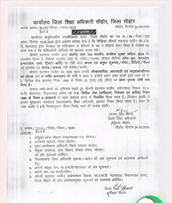 |MP Female Teacher Supported Pakistani Army : सीहोर, मध्यप्रदेश। मेहतवाड़ा के शासकीय उच्चतर माध्यमिक विद्यालय में पदस्थ शिक्षिका शहनाज परवीन को पाकिस्तान सेना के समर्थन में सोशल मीडिया पोस्ट करने के चलते निलंबित कर दिया गया है। मामला सामने आने के बाद जिला शिक्षा अधिकारी (DEO) संजय सिंह तोमर ने तुरंत प्रभाव से कार्रवाई की।