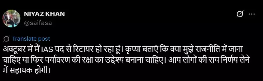 Niaz Khan Retirement: अक्टूबर में रिटायर होने वाले हैं IAS नियाज खान, एक्स पर पूछा - क्या मुझे राजनीति में जाना चाहिए