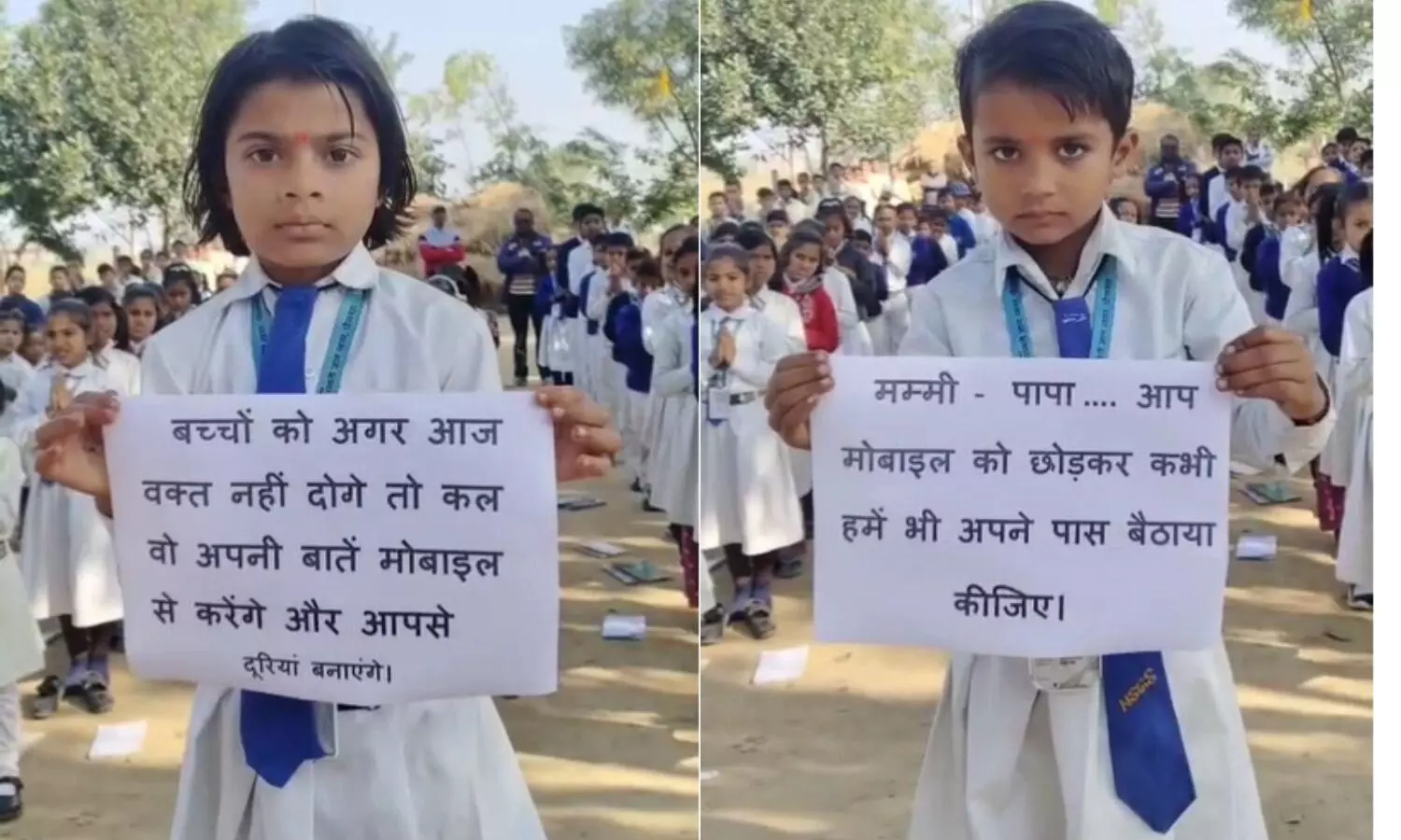 मोबाइल में डूबे पैरेंट्स को जगाने निकले मासूम, तख्ती में लिखा इमोशनल सवाल