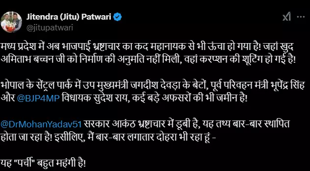 जीतू पटवारी ने एक्स पर लिखा, मध्य प्रदेश में अब भाजपाई भ्रष्टाचार का कद महानायक से भी ऊंचा हो गया है! जहां खुद अमिताभ बच्चन जी को निर्माण की अनुमति नहीं मिली, वहां करप्शन की शूटिंग हो गई है! भोपाल के सेंट्रल पार्क में उप मुख्यमंत्री जगदीश देवड़ा के बेटों, पूर्व परिवहन मंत्री भूपेंद्र सिंह और भाजपा विधायक सुदेश राय, कई बड़े अफसरों की भी जमीन है! मुख्यमंत्री सरकार आकंठ भ्रष्टाचार में डूबी है, यह तथ्य बार-बार स्थापित होता जा रहा है! इसीलिए, मैं बार-बार लगातार दोहरा भी रहा हूं - यह "पर्ची" बहुत महंगी है!