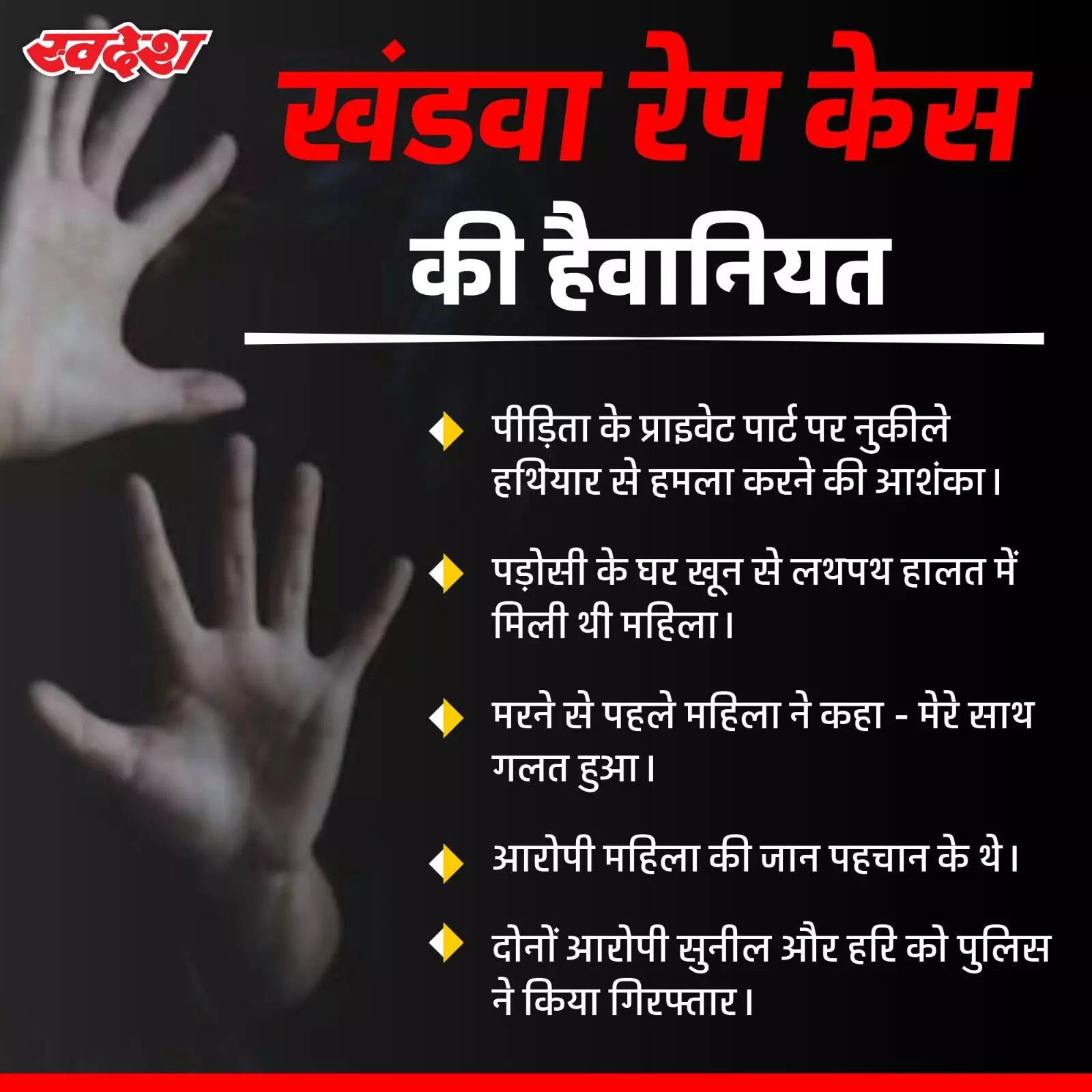 खंडवा जिले के खालवा थाना क्षेत्र के एक गांव में 45 वर्षीय महिला के साथ रेप की वारदात हुई। महिला अपने पड़ोस के ही एक घर में बेहोशी की हालत में मिली थी और उसे तेज ब्लीडिंग हो रही थी। डॉक्टरों की शुरुआती रिपोर्ट में महिला के प्राइवेट पार्ट पर गंभीर चोटों के निशान मिले हैं, जिससे दुष्कर्म की पुष्टि होती है। पुलिस ने मामला दर्ज कर जांच शुरू कर दी है।