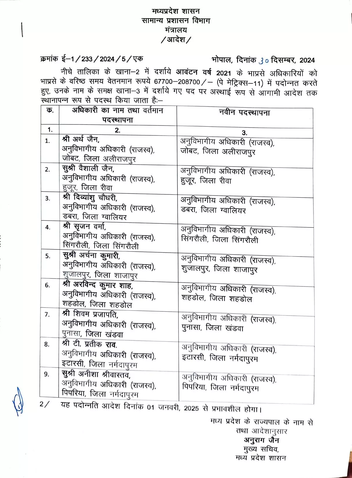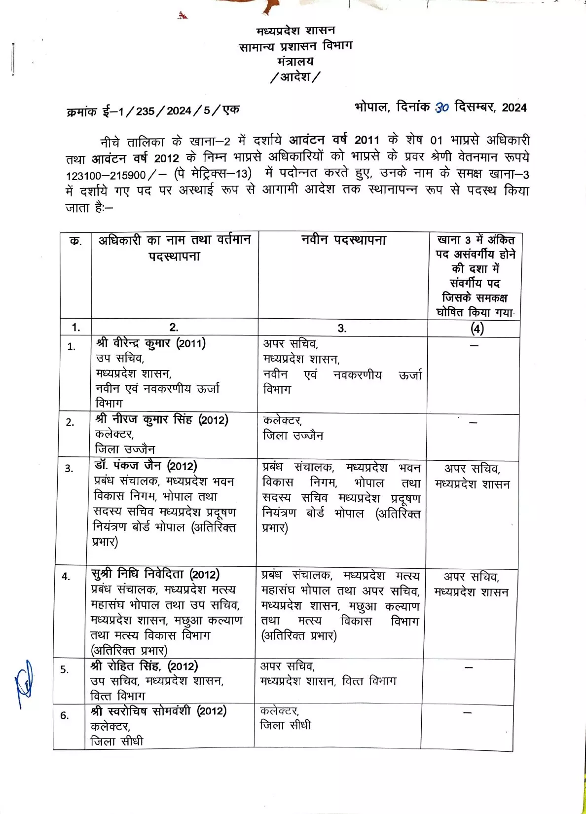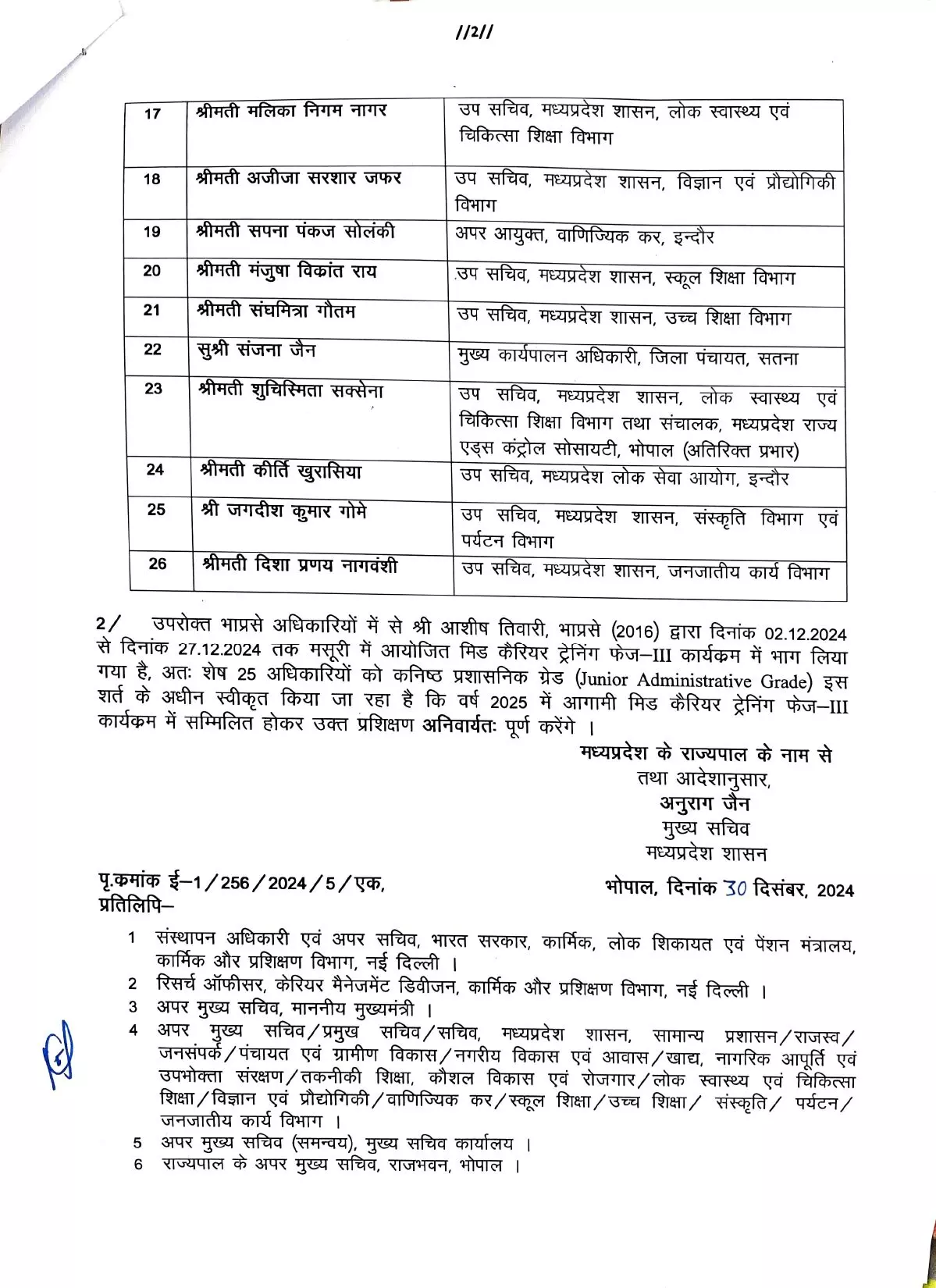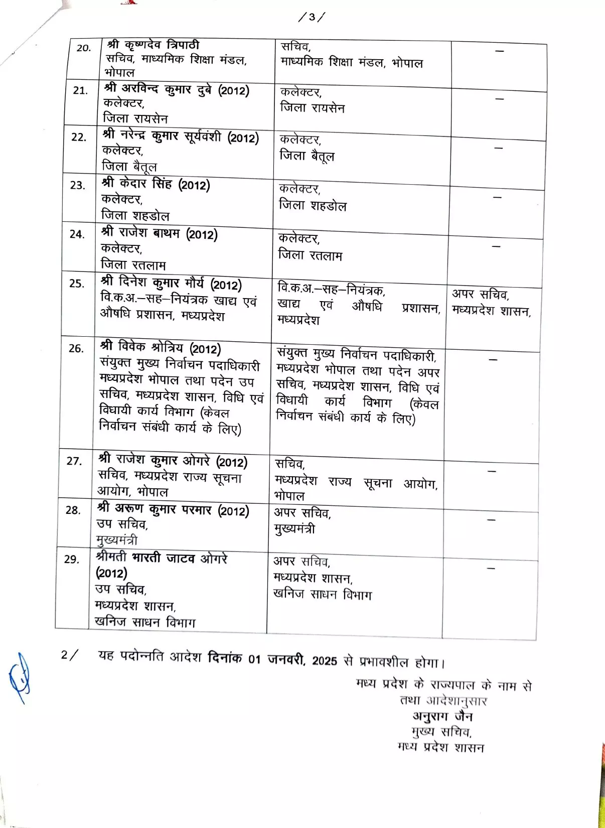 |MP IAS Promotion : भोपाल। नए साल पर मध्यप्रदेश के कई आईएएस अधिकारी प्रमोट हुए हैं। सामान्य प्रशासन विभाग द्वारा प्रमोट किये गए अधिकारियों की सूची जारी की गई है। इस सूची में मध्यप्रदेश के कई चर्चित आईएएस अधिकारियों के नाम शामिल है। नए साल यानी 1 जनवरी 2025 से यह आदेश प्रभावी होगा।