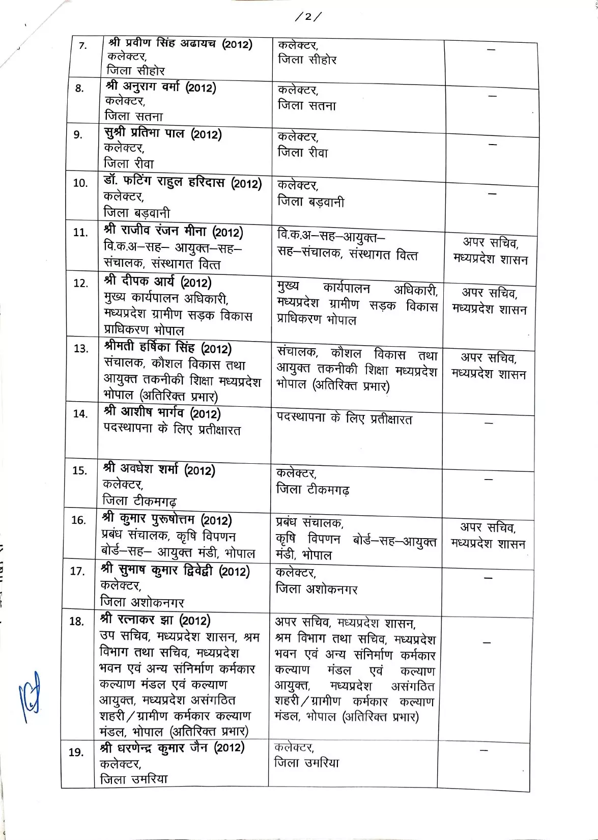 सामान्य प्रशासन विभाग द्वारा आवंटन वर्ष 2011 एवं 2012 के भारतीय प्रशासनिक सेवा के अधिकारियों को प्रवर श्रेणी वेतनमान में पदोन्नत किए जाने संबंधी आदेश जारी किए गए हैं।