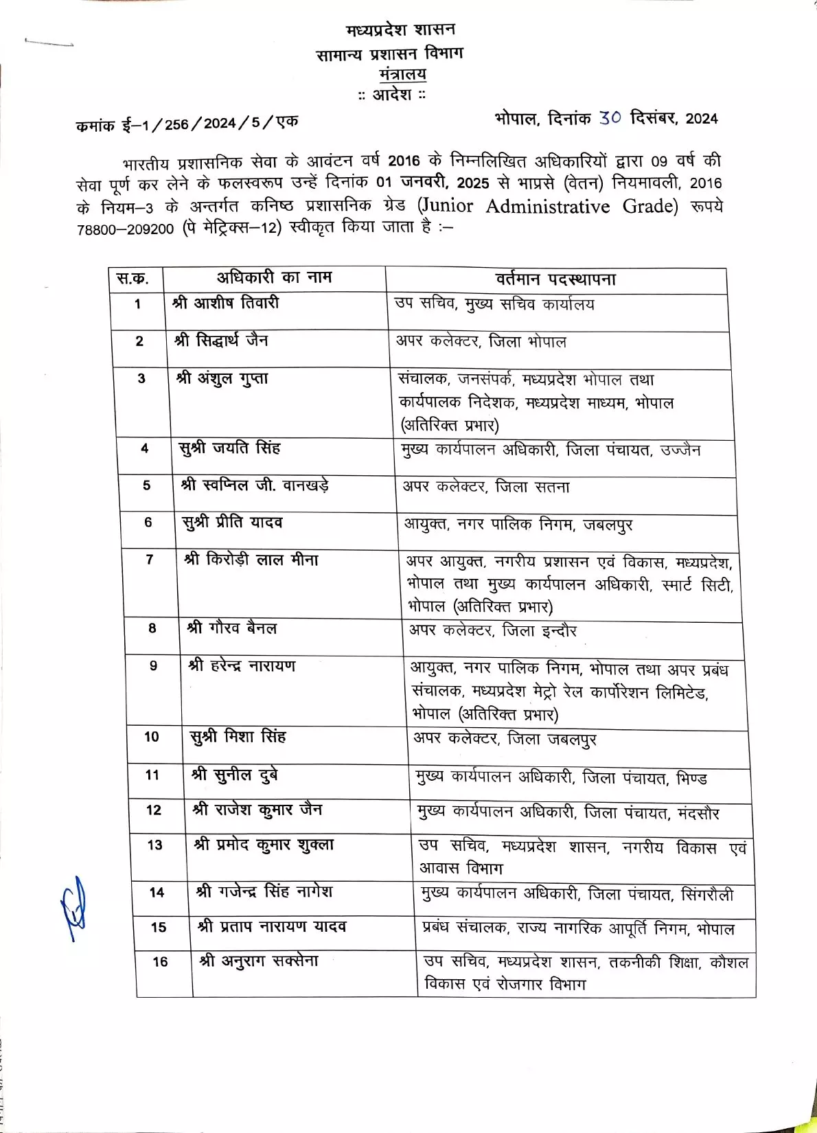सामान्य प्रशासन विभाग द्वारा आवंटन वर्ष 2016 के भारतीय प्रशासनिक सेवा के अधिकारियों द्वारा 9 वर्ष की सेवा पूर्ण करने पर IAS (वेतन) नियमावली, 2016 के नियम-3 के अन्तर्गत कनिष्ठ प्रशासनिक ग्रेड रुपये 78800-209200 (पे मेट्रिक्स-12) स्वीकृत किए जाने संबंधी आदेश जारी।