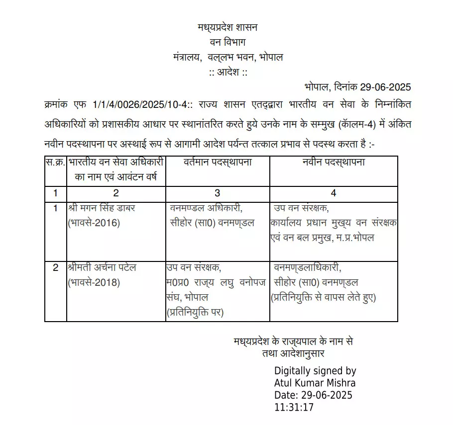 |मध्यप्रदेश। केंद्रीय मंत्री शिवराज सिंह चौहान और मुख्यमंत्री डॉ. मोहन यादव के बीच हुई बैठक के बाद राज्य सरकार ने दो IFS अधिकारियों का प्रशासनिक स्तर पर तबादला कर दिया है। सीहोर में बारिश के दौरान लोगों के घर तोड़े जाने को लेकर हुए विवाद के बाद वनमंडल अधिकारी मगन सिंह डाबर को उनके पद से हटा दिया गया है।