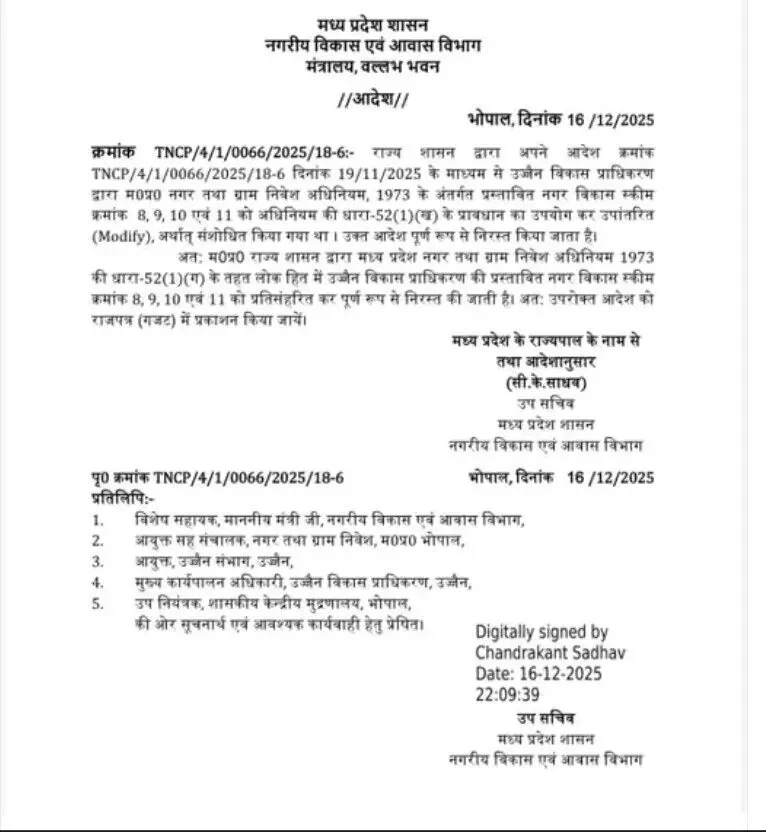 उक्त आदेश को अब पूर्ण रूप से निरस्त किया जाता है। आदेश में यह भी स्पष्ट किया गया है कि लोकहित में उज्जैन विकास प्राधिकरण की प्रस्तावित नगर विकास स्कीम को प्रतिसंहरित कर पूर्णतः निरस्त किया जाता है। साथ ही इस आदेश को राजपत्र में प्रकाशित कराए जाने का भी उल्लेख किया गया है।