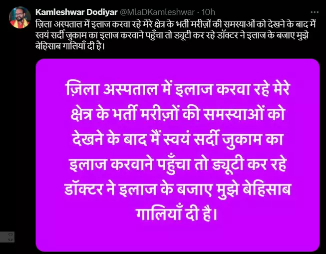 इस मामले को लेकर विधायक कमलेश्वर डोडियार ने कहा कि, "ज़िला अस्पताल में इलाज करवा रहे मेरे क्षेत्र के भर्ती मरीज़ों की समस्याओं को देखने के बाद मैं स्वयं सर्दी जुकाम का इलाज करवाने पहुँचा तो ड्यूटी कर रहे डॉक्टर ने इलाज के बजाए मुझे बेहिसाब गालियाँ दी है।"