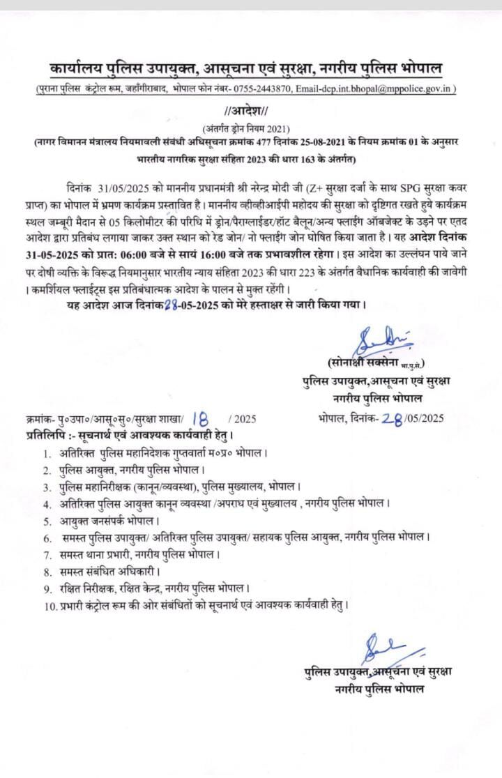 31 मई 2025 को प्रधानमंत्री नरेन्द्र मोदी (Z+ सुरक्षा दर्जा के साथ SPG सुरक्षा कवर प्राप्त) का भोपाल में भ्रमण कार्यक्रम प्रस्तावित है। व्हीव्हीआईपी की सुरक्षा को दृष्टिगत रखते हुये कार्यक्रम स्थल जम्बूरी मैदान से 5 किलोमीटर की परिधि में ड्रोन, पैराग्लाईडर, हॉट बैलून, अन्य फ्लाईंग ऑबजेक्ट के उड़ने पर प्रतिबंध लगाया गया है। उक्त स्थान को रेड जोन या नो फ्लाईंग जोन घोषित किया जाता है। यह आदेश दिनांक 31 मई 2025 को सुबह 6:00 बजे से शाम 16:00 बजे तक प्रभावशील रहेगा। इस आदेश का उल्लंघन पाये जाने पर दोषी व्यक्ति के विरूद्ध नियमानुसार भारतीय न्याय संहिता 2023 की धारा 223 के अंतर्गत वैधानिक कार्यवाही की जावेगी। कमर्शियल फ्लाईट्स इस प्रतिबंधात्मक आदेश के पालन से मुक्त रहेंगी।