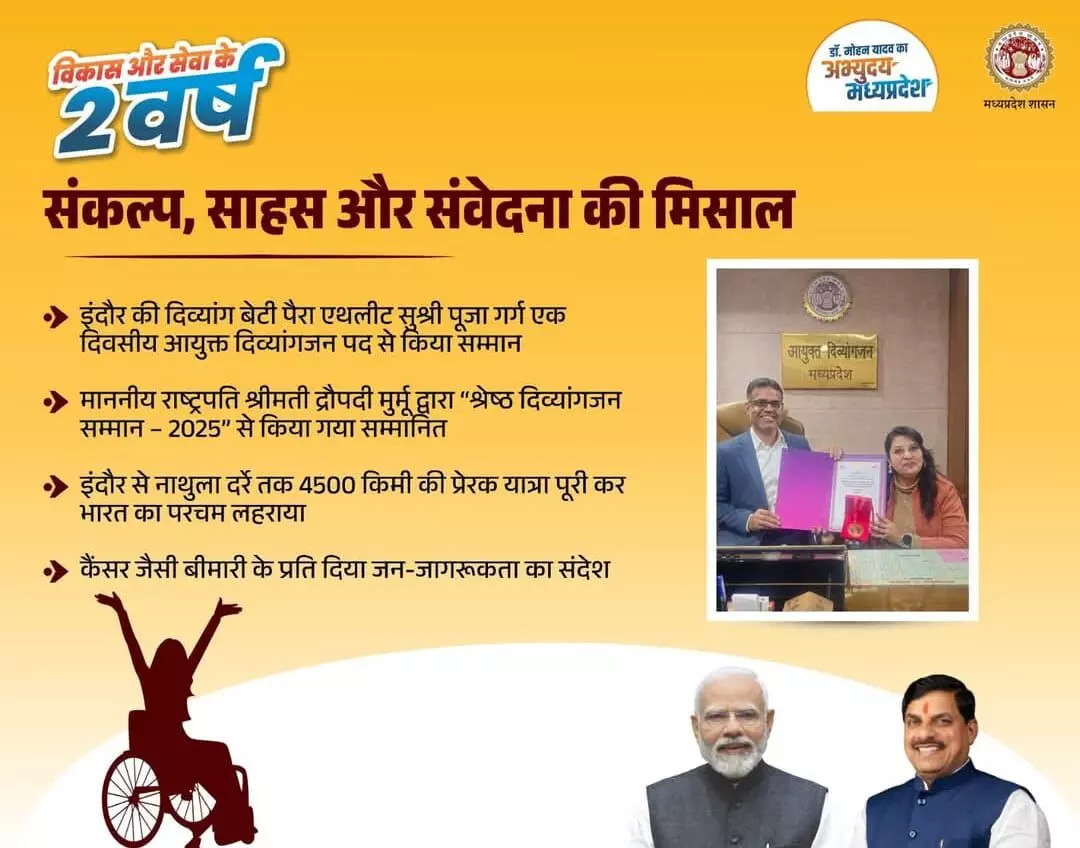 मुख्यमंत्री डॉ. मोहन यादव ने पैरा एथलीट पूजा गर्ग को वर्ष 2025 के लिए 'श्रेष्ठ दिव्यांगजन' पुरस्कार से सम्मानित होने पर बधाई दी। मुख्यमंत्री डॉ. यादव ने कहा कि इंदौर की बेटी सुश्री पूजा ने नाथुला दर्रे पर तिरंगा फहराने वाली विश्व की पहली महिला होने की ऐतिहासिक उपलब्धि हासिल की है। मध्यप्रदेश को उन पर गर्व है।