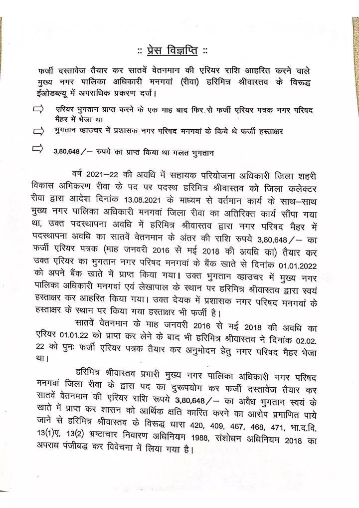बताया जा रहा है कि, साल 2021-22 की अवधि में सहायक परियोजना अधिकारी जिला शहरी विकास अभिकरण रीवा के पद पर पदस्थ हरिमित्र श्रीवास्तव को जिला कलेक्टर रीवा द्वारा वर्तमान कार्य के साथ-साथ मुख्य नगर पालिका अधिकारी मनगवां जिला रीवा का अतिरिक्त कार्य सौंपा गया था। उक्त पदस्थापना अवधि में हरिमित्र श्रीवास्तव द्वारा नगर परिषद मैहर में पदस्थापना अवधि का सातवें वेतनमान के अंतर की राशि रुपये 3,80,648/- का फर्जी एरियर पत्रक (माह जनवरी 2016 से मई 2018 की अवधि का) तैयार कर उक्त एरियर का भुगतान नगर परिषद मनगवां के बैंक खाते से अपने बैंक खाते में प्राप्त किया गया।