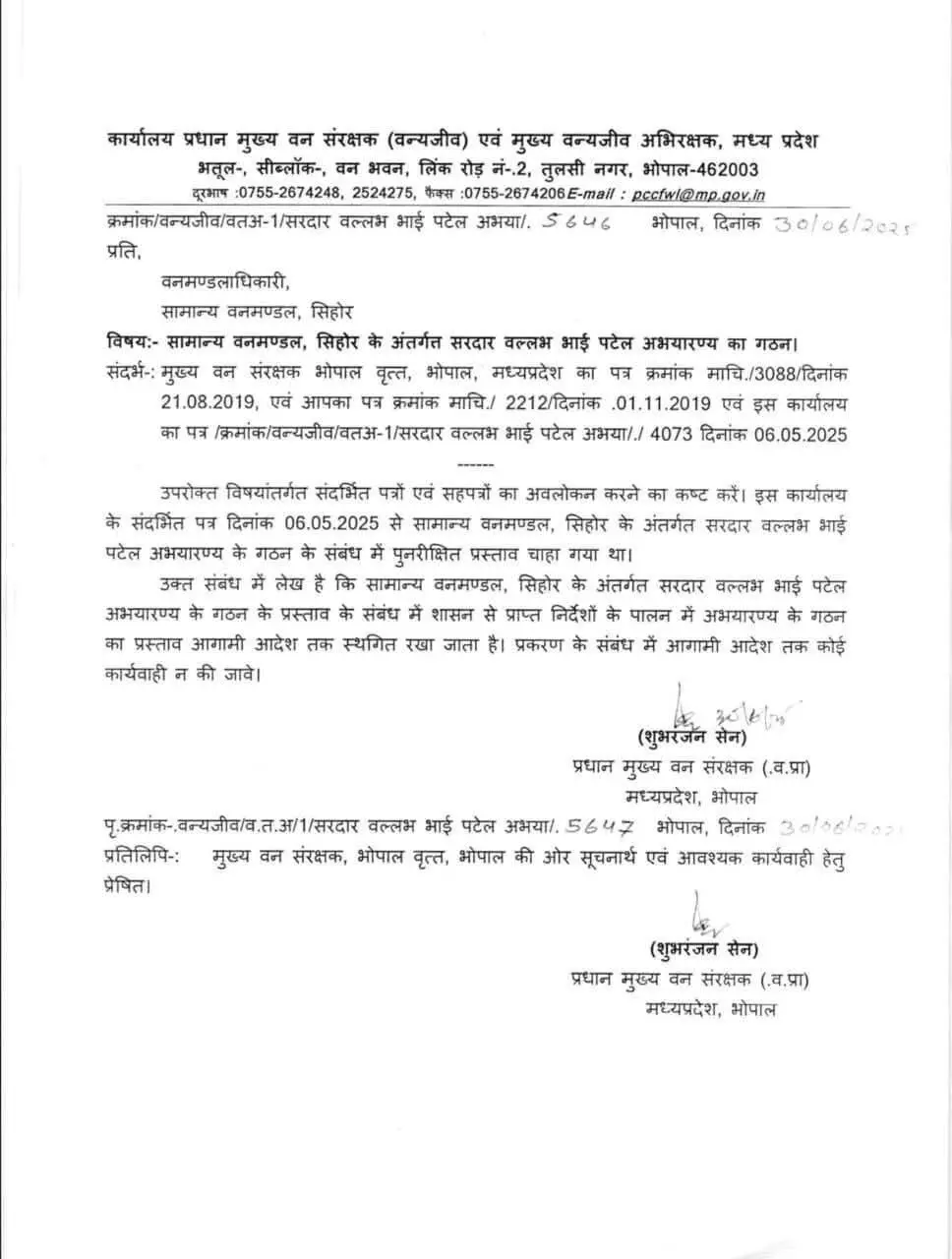 जारी आदेश में कहा गया है कि, 'सिहोर के अंतर्गत सरदार वल्लभ भाई पटेल अभयारण्य के गठन के संबंध में पुनरीक्षित प्रस्ताव चाहा गया था। उक्त संबंध में लेख है कि सामान्य वनमण्डल, सिहोर के अंतर्गत सरदार वल्लभ भाई पटेल अभयारण्य के गठन के प्रस्ताव के संबंध में शासन से प्राप्त निर्देशों के पालन में अभयारण्य के गठन का प्रस्ताव आगामी आदेश तक स्थगित रखा जाता है। प्रकरण के संबंध में आगामी आदेश तक कोई कार्यवाही न की जावे।'