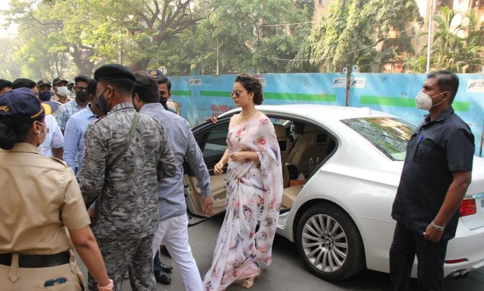 कंगना रनौत मुंबई पुलिस के सामने हुई पेश, सफेद साड़ी और काला चश्मा पहनकर पहुंची थाने