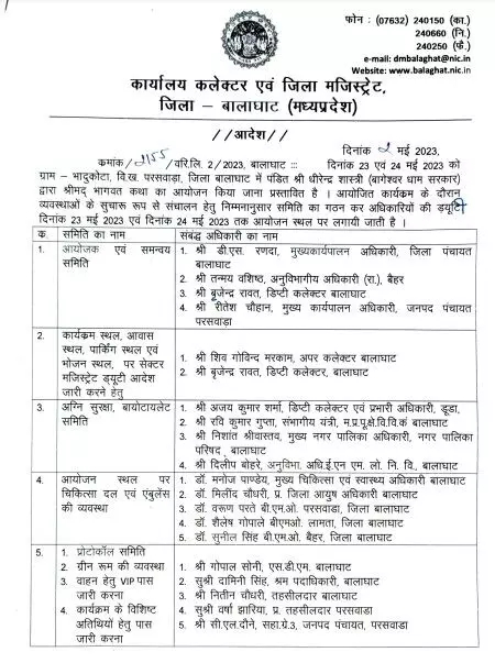 |बालाघाट। पंडित धीरेन्द्र शास्त्री की बालाघाट में 23 और 24 मई को श्रीमद भागवत कथा का आयोजन होने वाला है। इस कार्यक्रम की व्यवस्था की जिम्मेदारी जिले के प्रशासनिक अधिकारियों को दी गई है। कलेक्टर डॉ. गिरीश कुमार मिश्रा के आदेश में अलग-अलग कामों के लिए अलग-अलग अधिकारियों को जिम्मा सौंपा है। जिसके तहत जिला आयुष अधिकारीयों को कथा में आने वाले श्रोताओं को दातुन देनेकी जिम्मेदारी दी गई है।