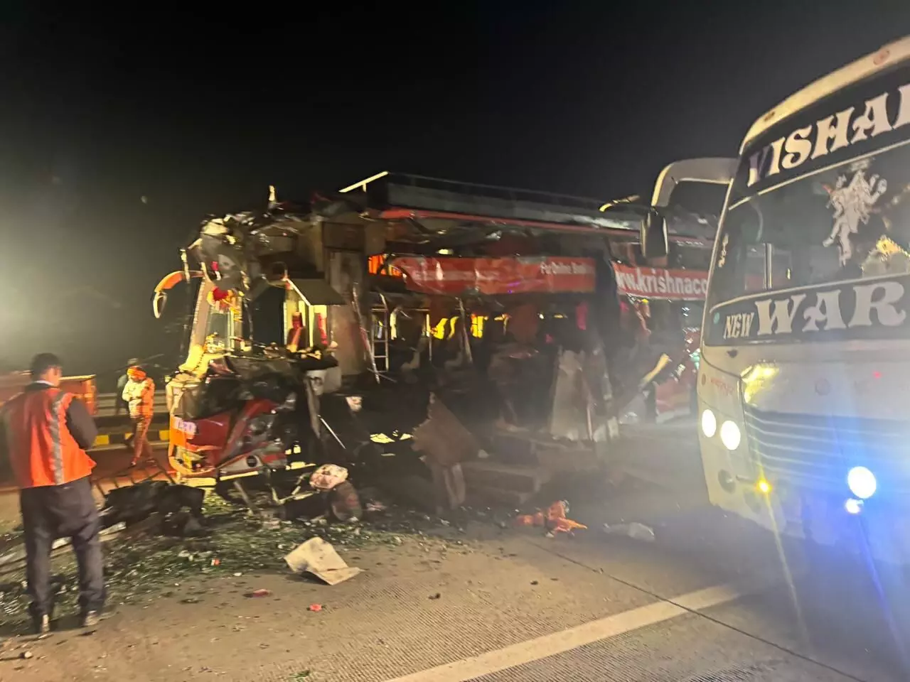 जानकारी के अनुसार, ट्रक बीयर बोतलों के स्क्रैब से भरा हुआ था। दर्दनाक सड़क हादसे में बस के परखच्चे उड़ गए। इस हादसे में पांच माह के बच्चे, महिला और 3 पुरुषों की मौत हुई है। यह डबल डेकर प्राइवेट बस दिल्ली से आज़मगढ़ जा रही थी। बस में सवार लोग खिड़कियां तोड़कर बाहर निकल सके।