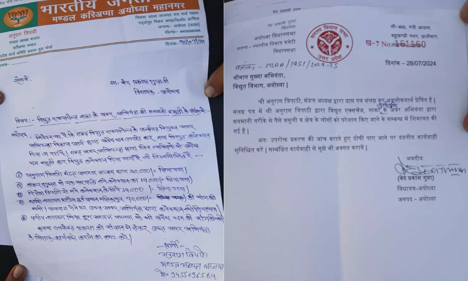 अयोध्या। नाका विद्युत उपकेंद्र के जेई पर नियम और कायदे कानून को दरकिनार कनेक्शन देने का गंभीर आरोप लगा है। सत्ताधारी दल के नगर विधायक वेद प्रकाश गुप्ता एवं मंडल अध्यक्ष अनुराग त्रिपाठी ने इसकी लिखित शिकायत भी की है। बावजूद इसके भ्रष्टाचार के आकंठ में डूबे विद्युत विभाग के आला अफसर आरोपी जेई पर कार्यवाही करने के बजाय उसके भ्रष्टाचार को लगातार बढ़ावा व संरक्षण देने में जुटे है।