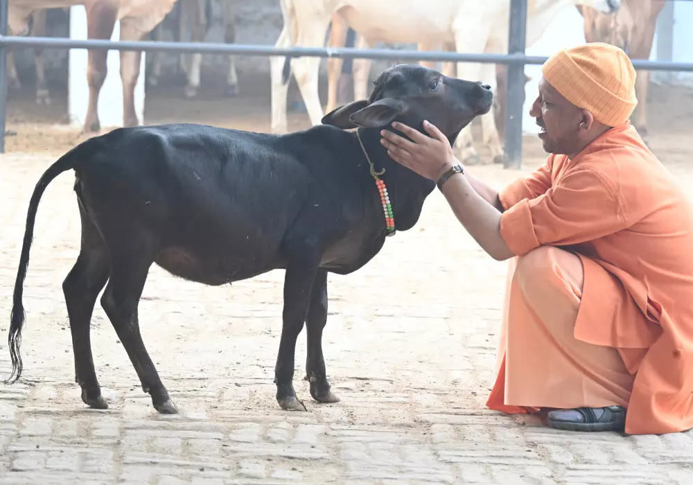 मंदिर की गौशाला में सीएम योगी ने की गोसेवा :