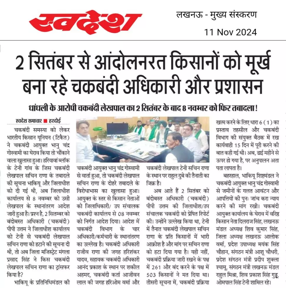 |जिलाधीश/उप संचालक चकबंदी ने 08 नवम्बर को किया था लेखपाल को हटाने का आदेश, स्वदेश में प्रमुखता से समाचार प्रकाशन बाद निलंबन आदेश सोमवार को भाकियू को भेजा