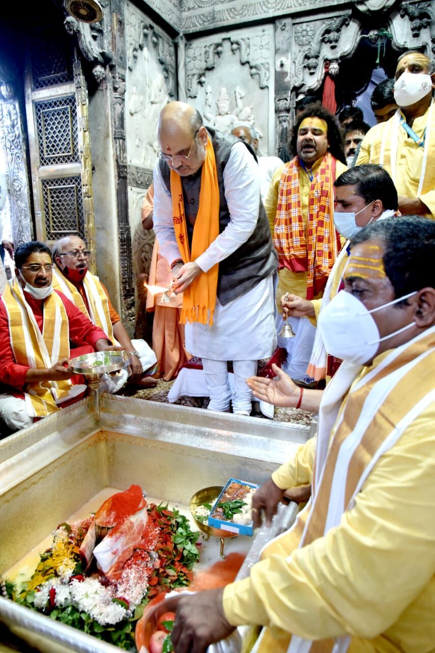 गर्भगृह में जाकर गृह मंत्री ने बाबा श्री काशी विश्वनाथ का विधि विधान से पूजन अर्चन किया। मंदिर के पांच अर्चकों द्वारा षोडशोपचार पूजन कराया गया। पूजन करने के पश्चात मुख्यमंत्री ने गृहमंत्री को अंगवस्त्रम, रुद्राक्ष की माला और पीतल की शंख देकर सम्मानित किया। ततपश्चात गृहमंत्री अतिथि कक्ष में पहुंचे जहां उन्होंने मंदिर को शासन द्वारा तैयार की गई एक पीपीटी को देखा। इस पीपीटी में मंदिर के अद्यतन जानकारी और चल रहे निर्माण कार्यों के बारे में जानकारी कमिश्नर दीपक अग्रवाल द्वारा दी गई। मुख्यमंत्री योगी आदित्यनाथ ने गृहमंत्री को बताया कि श्रद्धालुओं को देखते हुए मंदिर परिसर, मंदिर चौक, यात्री सुविधा केंद्र, मुमुक्षु भवन, भोग शाला, यूटिलिटी बिल्डिंग, सुरक्षा भवन बनाया जा रहा है। इसमें से अधिकतर कार्य पूर्ण कर लिए गए हैं। जेट्टी और घाट डेवलेपमेंट का कार्य भी चल रहा है।
