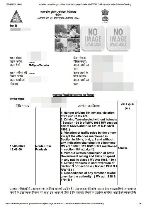 |उत्तरप्रदेश। नोएडा में सड़क पर बाइक चलाते हुए इश्कबाजी' करने पर ट्रेफिक पुलिस ने 53500 रुपए का चालान काटा है। इतना अधिक चालान काटने के चलते यह घटना चर्चा का विषय बन गई है। ट्रेफिक पुलिस ने सख्त एक्शन लेते हुए यह साफ कर दिया है कि, नियमों की अनदेखी करने वालों के खिलाफ इसी तरह का एक्शन लिया जाएगा।