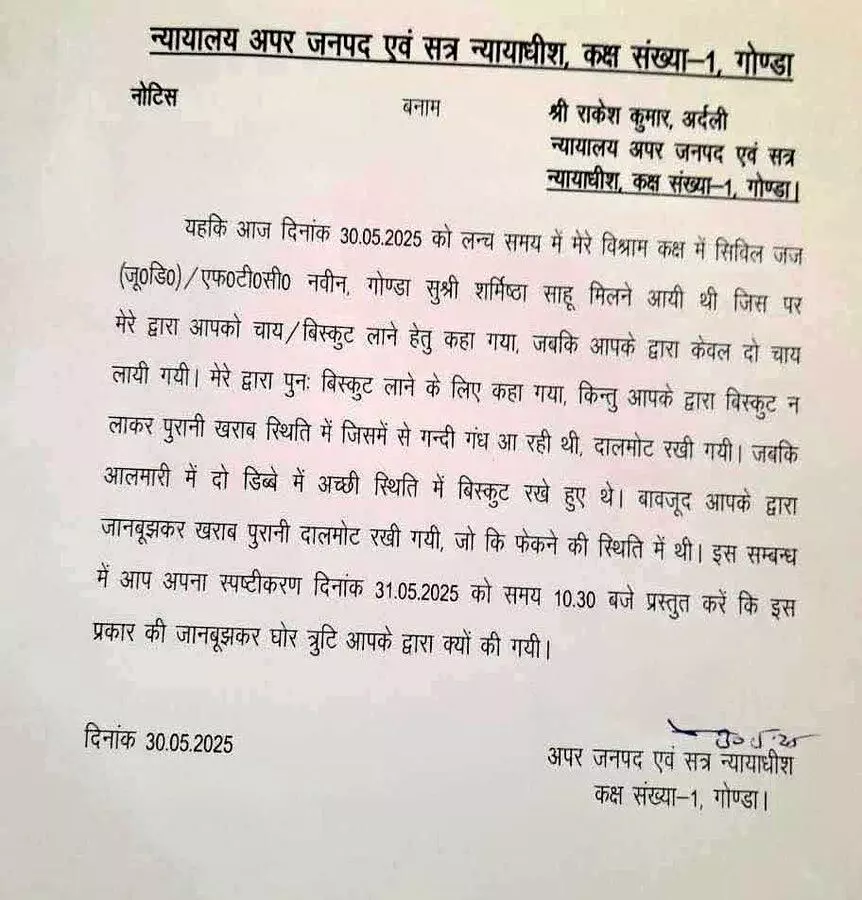 दरअसल, गोंडा जज द्वारा कर्मचारी को दिए गए नोटिस में कहा गया है कि, दिनांक 30 मई 2025 को लन्च समय में विश्राम कक्ष में सिविल जज (जू०डि०) / एफ०टी०सी० नवीन, गोण्डा सुश्री शर्मिष्ठा साहू मिलने आयी थी जिस पर कर्मचारी को चाय और बिस्कुट लाने के लिए कहा गया।कर्मचारी केवल दो चाय लेकर आया। इस पर जज ने एक बार फिर बिस्कुट लाने के लिए कहा लेकिन कर्मचारी ने बिस्कुट न लाकर पुरानी खराब दालमोट दी। दालमोट से गन्दी गंध आ रही थी।