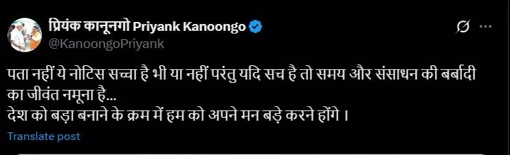 इस पूरे मामले पर राष्ट्रीय मानवाधिकार आयोग (NHRC) के सदस्य प्रियांक कानूनगो ने सोशल मीडिया एक्स हैंडल से प्रतिक्रिया दी है। वायरल हो रहे नोटिस की प्रति को साझा करते हुए कहा कि, पता नहीं ये नोटिस सच्चा है भी या नहीं परंतु यदि सच है तो समय और संसाधन की बर्बादी का जीवंत नमूना है…। देश को बड़ा बनाने के क्रम में हम को अपने मन बड़े करने होंगे।