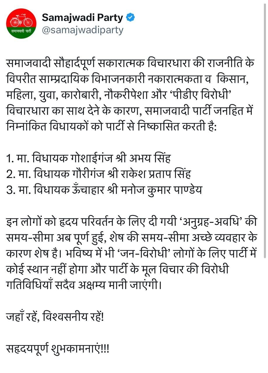 पार्टी ने बयान जारी करते हुए कहा है कि, "समाजवादी सौहार्दपूर्ण सकारात्मक विचारधारा की राजनीति के विपरीत साम्प्रदायिक विभाजनकारी नकारात्मकता व किसान, महिला, युवा, कारोबारी, नौकरीपेशा और ‘पीडीए विरोधी’ विचारधारा का साथ देने के कारण, समाजवादी पार्टी जनहित में विधायकों को पार्टी से निष्कासित करती है।"