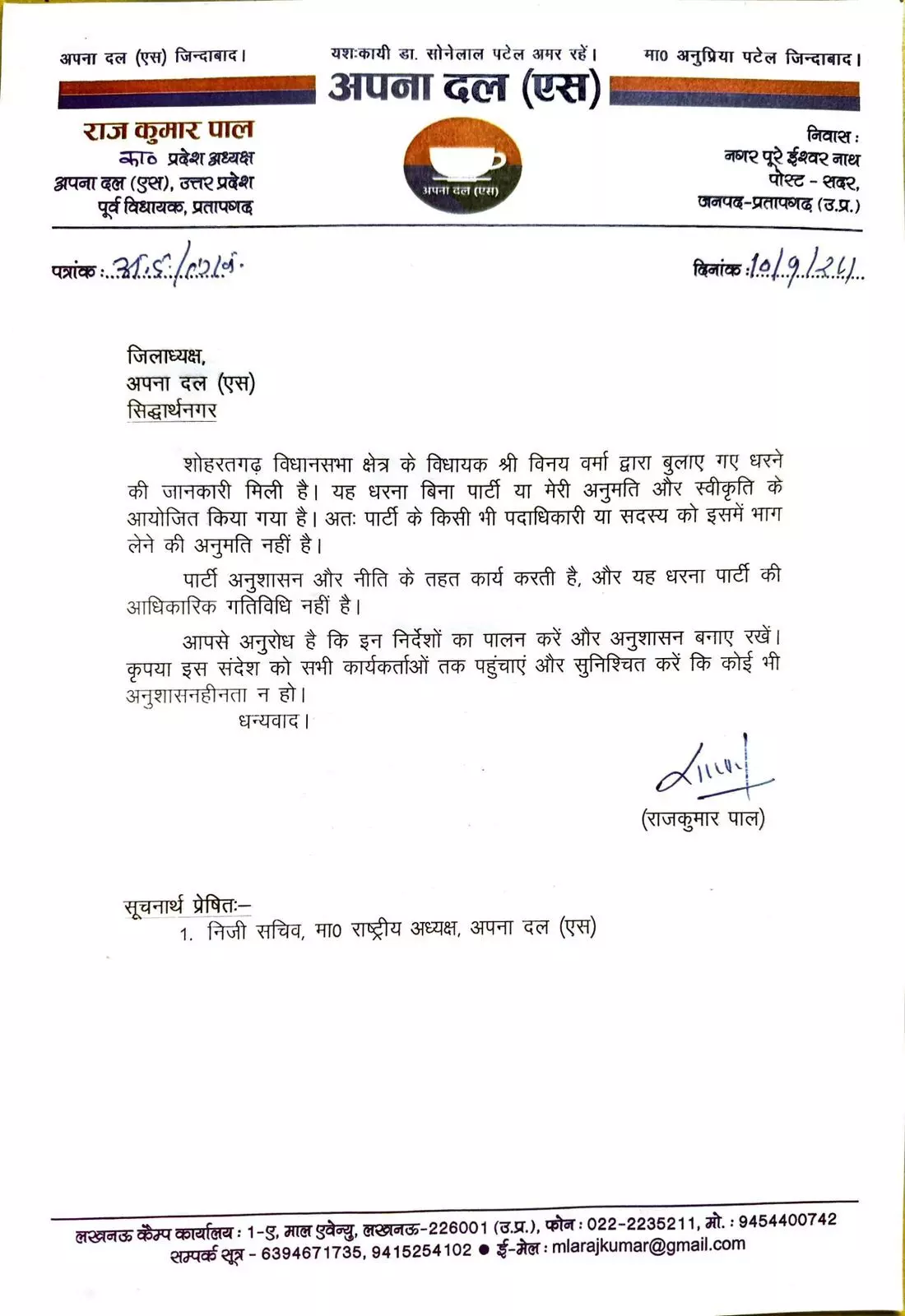अपनादल एस के विधायक के स्थानीय पुलिस के खिलाफ धरने के मामला में अपना दल एस के प्रदेश अध्यक्ष की चिट्ठी भी वायरल हो रही है। पार्टी प्रदेश अध्यक्ष ने लिखा धरने को पार्टी की अनुमति नहीं, पार्टी पदाधिकारी अगर धरने में गए तो अनुशासनहीनता मानी जाएगी।