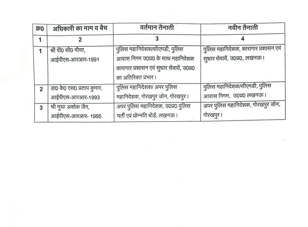 |UP IPS Transfer : उत्तरप्रदेश में तीन आईपीएस अधिकारियों के कार्यक्षेत्र बदले गए हैं। इनमें गोरखपुर जोन के एडीजी भी शामिल हैं। मुथा अशोक जैन को गोरखपुर जोन का नया एडीजी बनाया गया। गोरखपुर के एडीजी रहे डॉक्टर केएस प्रताप सिंह को पुलिस आवास निगम का सीएमडी बनाया गया है।