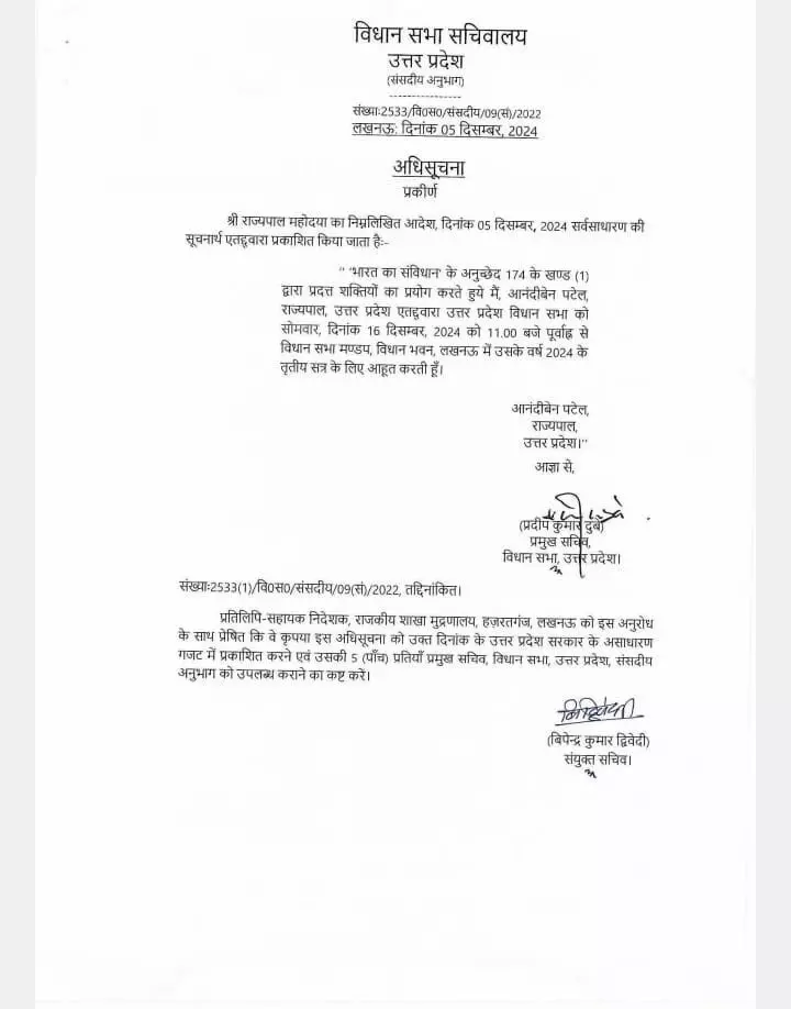 उत्तरप्रदेश: 16 दिसंबर से शुरू होगा विधानसभा का शीतकालीन सत्र, आदेश जारी