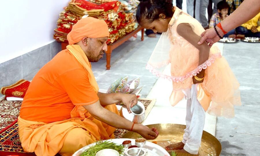 गौरतलब है कि कन्या पूजन का समय दोपहर 12 बजे निर्धारित था। मुख्यमंत्री के पहुंचने से पहले आमंत्रित कन्याएं पूजन स्थल पर पहुंच चुकी थीं। मुख्यमंत्री योगी आदित्यनाथ ने बारी-बारी से नौ कन्याओं और एक बटुक भैरव को खड़ा कर थार में लिए गए शुद्ध जल से उनका पांव पखारा। टीका लगाकर चुनरी ओढ़ाई और आरती उतारी। पूजन के बाद कन्याओं को भोजन कराने का कार्यक्रम शुरू हुआ।