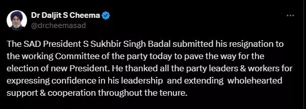 पार्टी के वरिष्ठ नेता दलजीत चीमा ने कहा कि शिरोमणि अकाली दल के अध्यक्ष सुखबीर सिंह बादल ने आज पार्टी की कार्यसमिति को अपना इस्तीफा सौंप दिया, ताकि नए अध्यक्ष के चुनाव का रास्ता साफ हो सके। उन्होंने अपने नेतृत्व में विश्वास जताने और पूरे कार्यकाल के दौरान पूरे दिल से समर्थन और सहयोग देने के लिए सभी पार्टी नेताओं और कार्यकर्ताओं का आभार व्यक्त किया।
