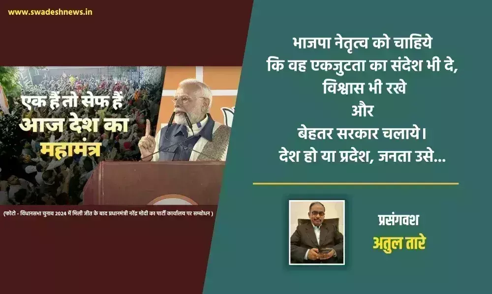 रांची से मुंबई की दूरी लगभग 1660 किलोमीटर है। राँची, भारत के पूर्वी दिशा में है तो मुंबई पश्चिम में | पूर्व और पश्चिम दिशा ने भारतीय राजनीति के दो विमर्श दिये हैं और साथ ही उत्तर प्रदेश ने, जो कि स्वाभाविक उत्तर में ही है। अपना भी उत्तर देकर पश्चिम के विमर्श को अपनी स्वीकृति यह कह कर दी है कि 'एक हैं तो सुरक्षित हैं । दक्षिण छोटा नागपुर और राँची में घुसपैठ बढ़ी है और भाजपा इनके लिए स्वाभाविक रूप से दुश्मन नंबर वन है। भाजपा ने यह चूक अवश्य की कि बाबूलाल मरांडी जैसे महाराष्ट्र का जनादेश यह अवसरवादी नेता और झारखंड घोषणा करता स्पष्ट दिखाई दे रहा मुक्ति मोर्चा के आधारहीन नेताओं है कि प्रदेश की सनातन और को अपने दल में स्थान ही नहीं सज्जन शक्ति ने एक स्वर में दिया बल्कि सिर पर बैठाया राष्ट्रीय हितों को अधिमान दिया है।